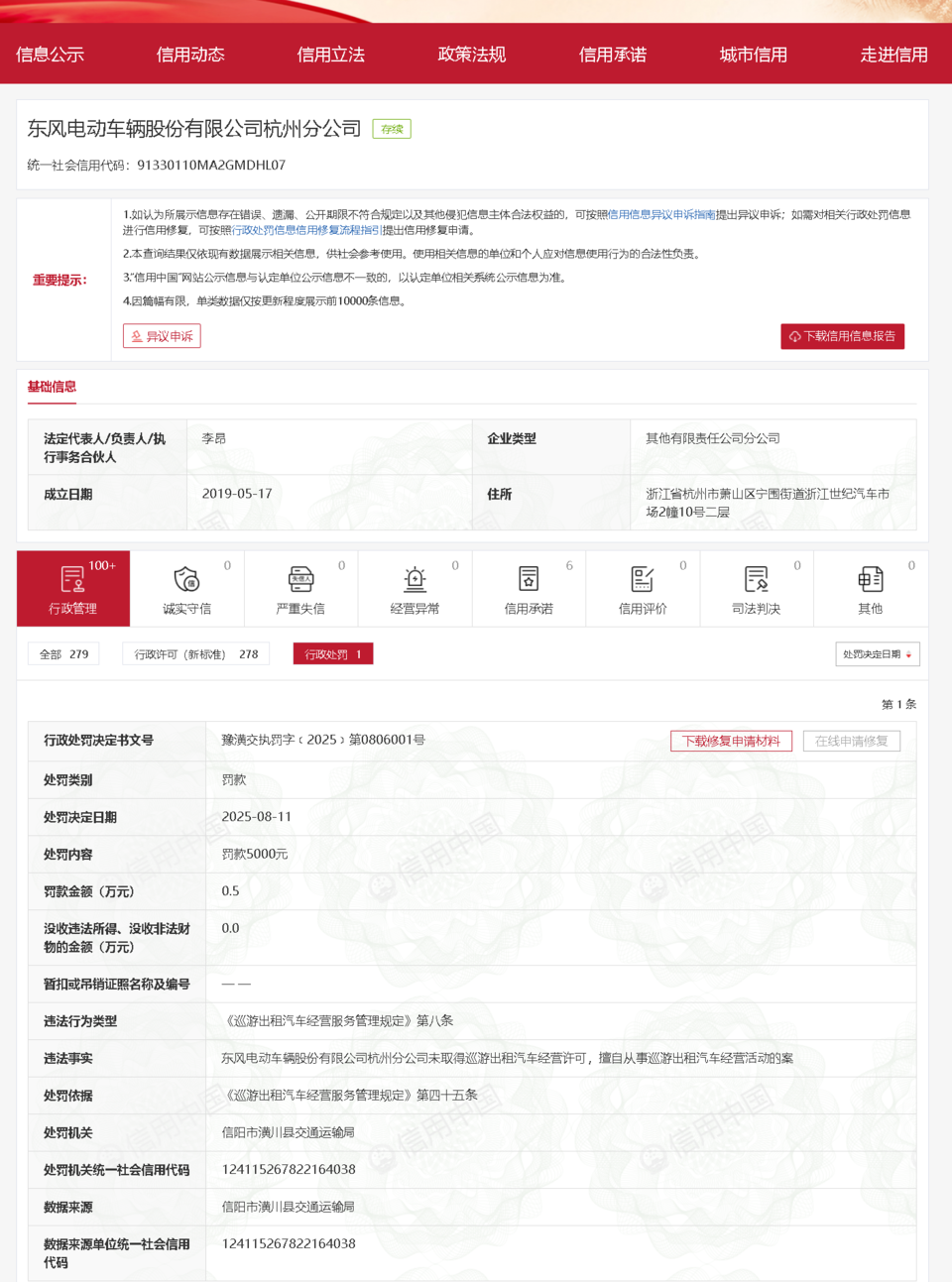 近日,记者从信用中国获悉,东风电动车辆股份有限公司杭州分公司因未取得巡游出租汽车经营许可最好的股票配资网站,擅自从事巡游出租汽车经营活动的案,被信阳市潢川县交通运输局罚款5000元。