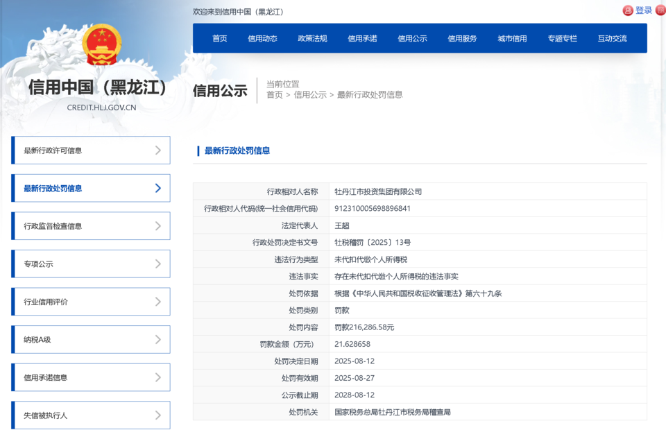 近日,记者从信用中国(黑龙江)获悉,牡丹江市投资集团有限公司因存在未代扣代缴个人所得税的违法事实炒股配资平台公司,被国家税务总局牡丹江市税务局稽查局罚款216,286.58元。