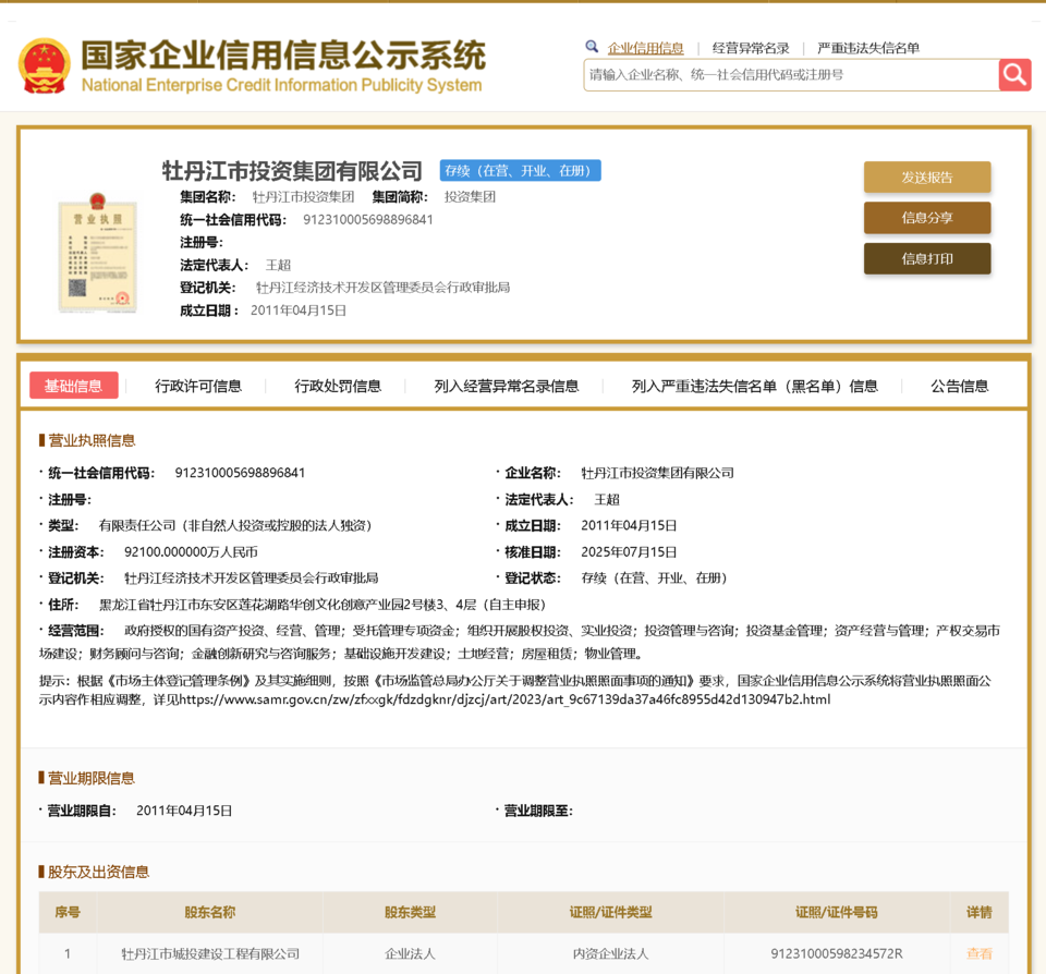 公开信息显示,牡丹江市投资集团有限公司成立于2011年4月15日,法定代表人王超,股东为牡丹江市城投建设工程有限公司。
